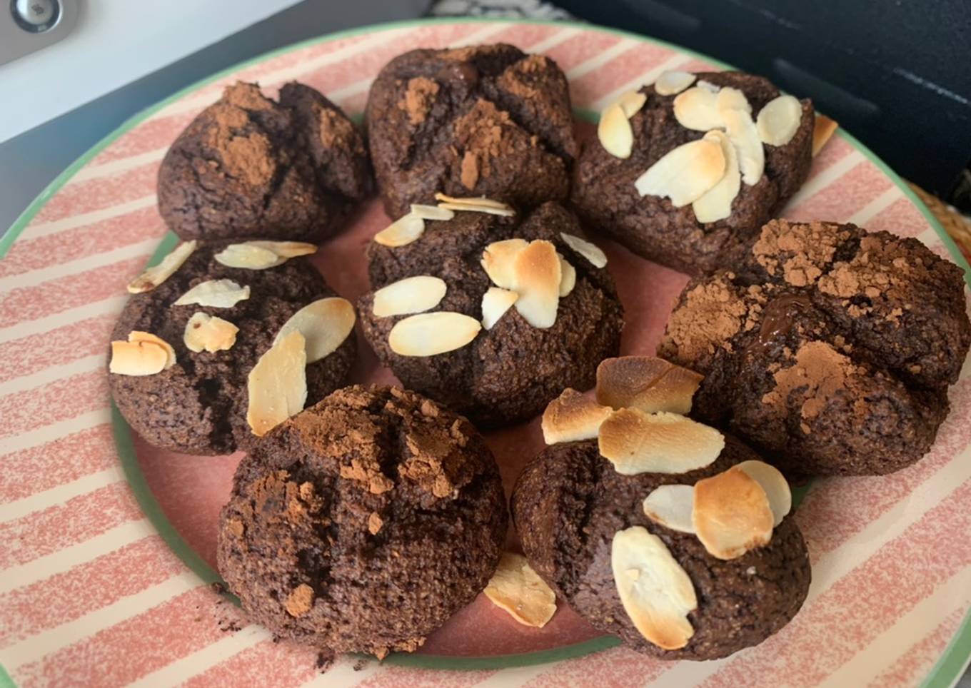 Yo rellené 4 de ellas con un trozo de chocolate 70% de cacao. Algunas las decoré con las almendras y otras con cacao en polvo