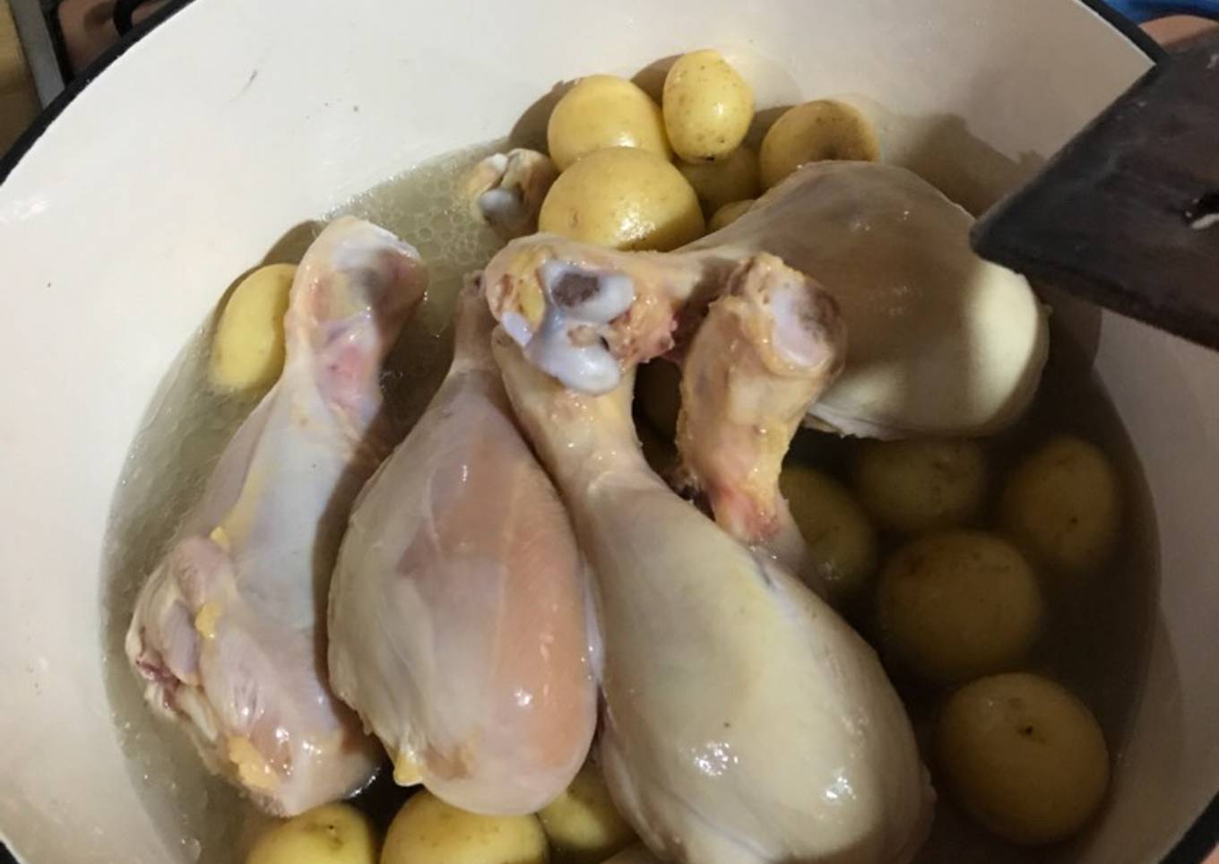 - Ya sofritas agrega las papas y que se frían un poco. Ya que percibas el olor a papa agrega agua a 3/4 de la cacerola, las ramitas de laurel y sal al gusto. Tapa la cacerola y deja que hierva hasta que el agua tenga consistencia densa.