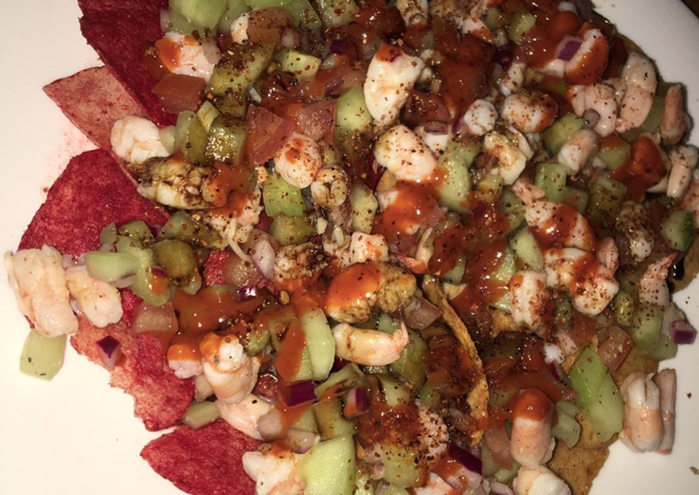 - Poner una cama de tostitos en el plato, la mezcla de ceviche, las salsas y chile en polvo al gusto.