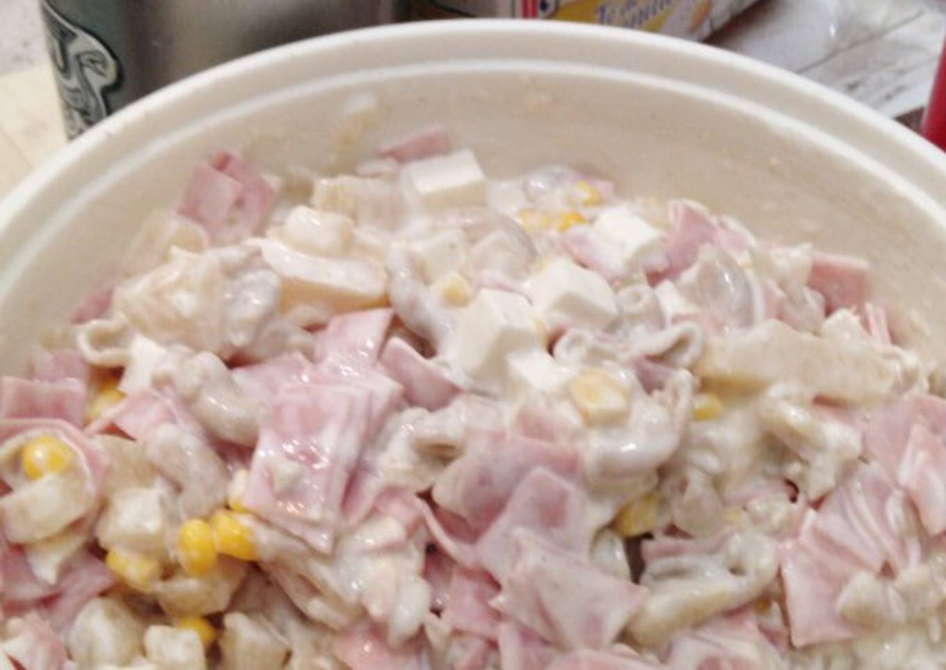 - Ya haya llegado ⌛25 min que escurrir. Mientras corté todo en cubitos la piña, jamón. luego eché la media crema, elote, la mayonesa 3 cdas. soperas. Lo revuelo bien. Una vez haya revuelto bien la piña, jamón elote la crema y la mayonesa, ya echar la pasta de codito. Eché poquito a poquito el almíbar lo revolví y por último al refrigerador.
