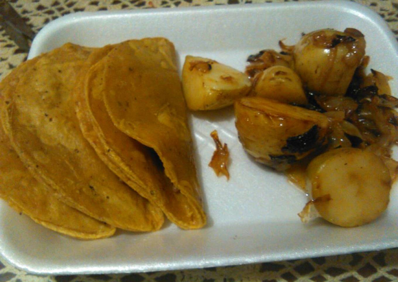- Partir la carne en pedacitos, partir las papas a la mitad las cocinas y mientras partes la cebolla en partes iguales y las cocinas luego tostas las tortitas con aceite y listoooo
