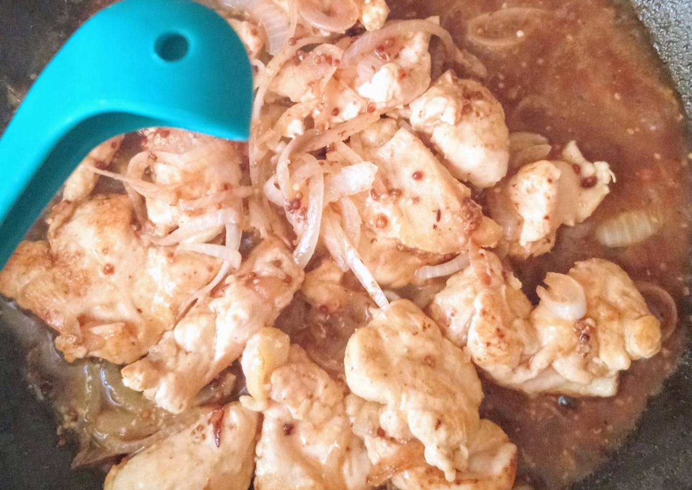 - Diluimos la mostaza en el caldo de pollo y lo vaciamos en el sartén con el pollo y la cebolla. Bajamos el fuego y esperamos a que se reduzca el caldo. Debe quedar un tono dorado y la cebolla caramelizada. Se sirve caliente