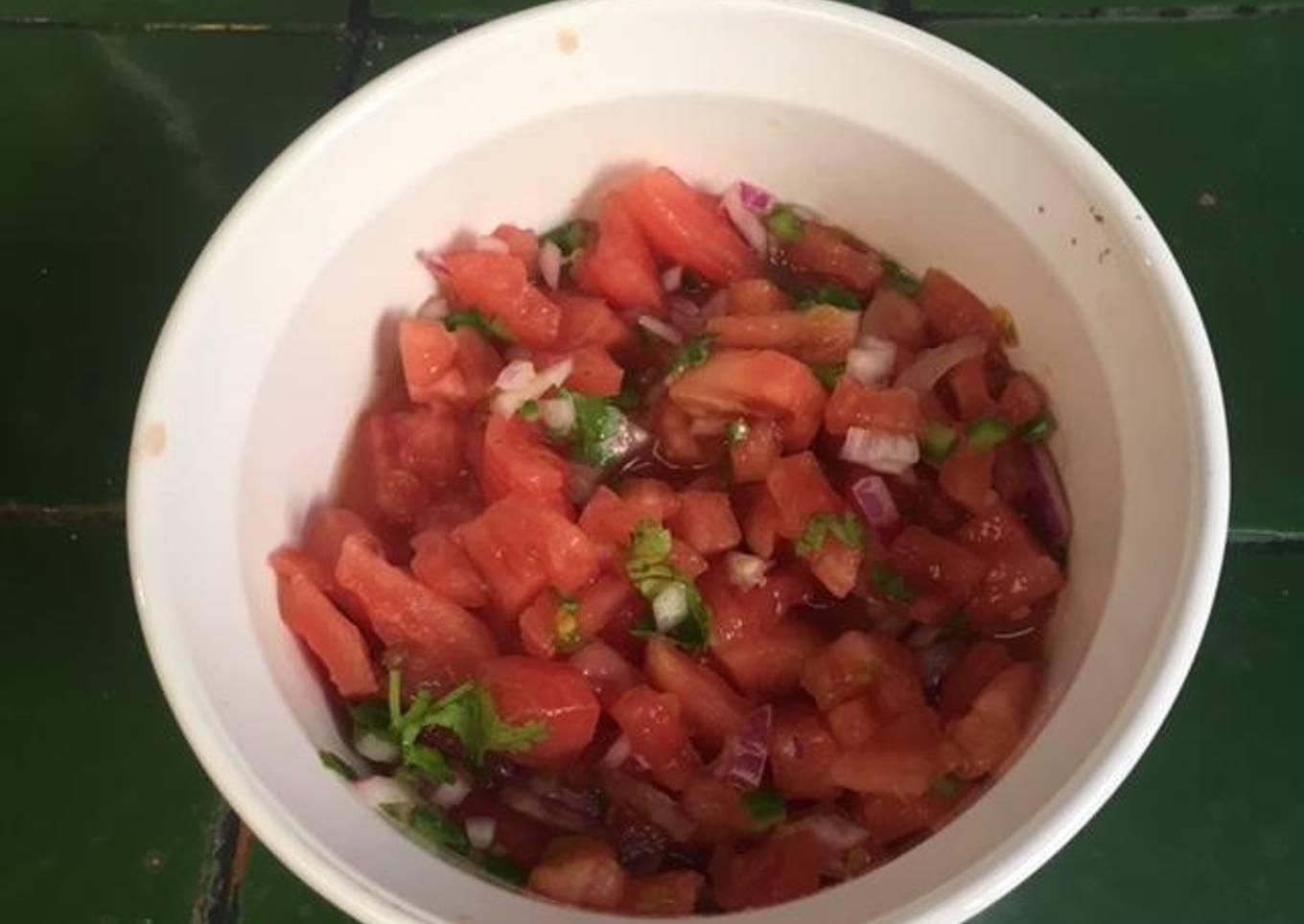 - Para hacerla pelamos y picamos dos jitomates, picamos muy finamente cebolla roja, 1 chile serrano le quitamos las venas y las semillas y lo picamos muy finito, una rama de cilantro la picamos muy finito y lo vaciamos todo en una salsera le ponemos sal, ajo en polvo y 1 cucharadita de vinagre. Es deliciosa.