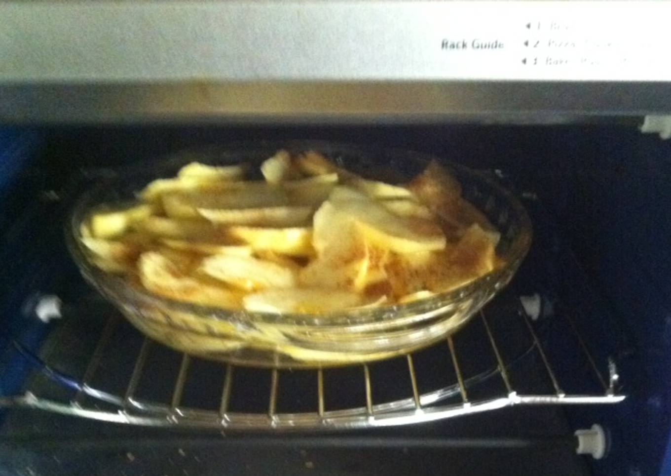 - Los perones o manzanas se pelan, se cortan en rajitas delgaditas y se van acomodando en un molde enmantequillado a cubrirlo, se rocían con azúcar y canela en polvo, unas nueces picadas, un chorrito de vino blanco y por encima unos trocitos de mantequilla.